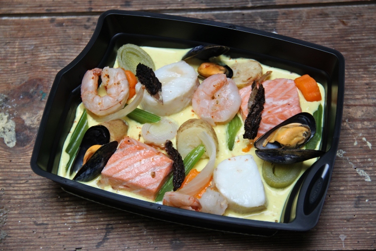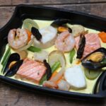 Saumon, cabillaud, crevette, moules, pomme de terre, carotte, céleri branche, sauce fumet crème vin blanc