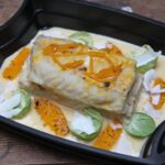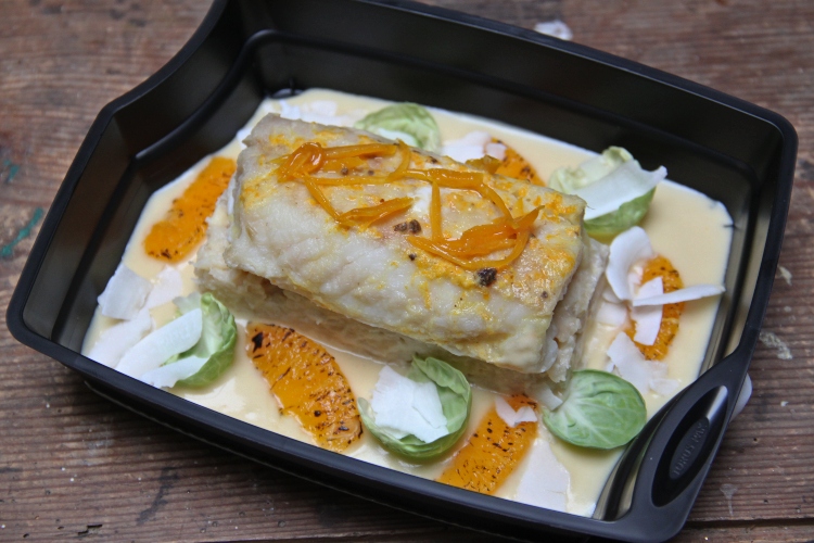 Cabillaud au beurre d’orange, celerisotto au lait de coco, suprêmes d’oranges brûlées et coques de choux de Bruxelles