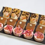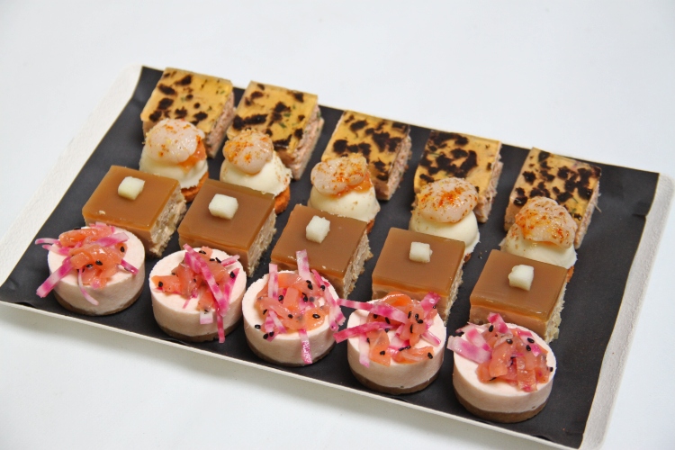 - Cheesecake panna cotta au saumon fumé, chioggia et sésame noir : panna cotta (CREME, SAUMON fumé, gélatine, citron confit, sel, poivre), cheesecake (BEURRE ½ sel, PARMESAN, farine de BLE, poudre d’AMANDE), appareil chioggia et sésame (betterave chioggia, SAUMON fumé, huile d’olive, SESAME, sel, poivre), zest de citron jaune.
