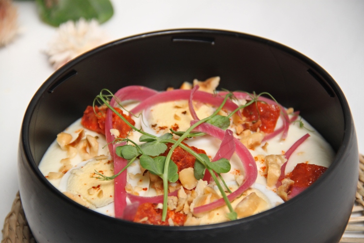 Caviar de potimarrons, pickles de champignons, crumble de parmesan, vinaigrette de noisette (gluten, lactose, moutarde, fruits à coque, sulfites)
