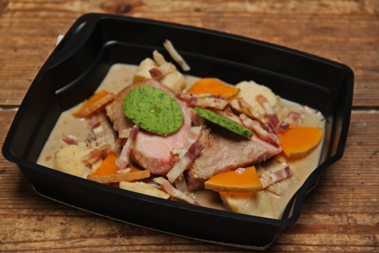 Ingrédients : Veau*, gnocchi (pomme de terre, farine de blé (GLUTEN), ŒUF entier, parmesan râpé (LAIT), pâte de truffe), sauce crème de cèpes (fond de veau (veau*, garniture aromatique (CELERI), pulpe de tomates, vin rouge (SULFITES)), cèpe, crème (LAIT), échalote, beurre ½ sel (LAIT), ail, piment d’Espelette, sel), pleurote, butternut mariné (butternut, huile d’olive, jus de citron, sucre, sel), poitrine séchée*, huile de tournesol, viennoise de basilic (pain de mie (farine de blé (GLUTEN), eau, huile de tournesol, levure, sucre, LAIT), beurre ½ sel (LAIT), basilic, persil, sel), fleur de sel.
