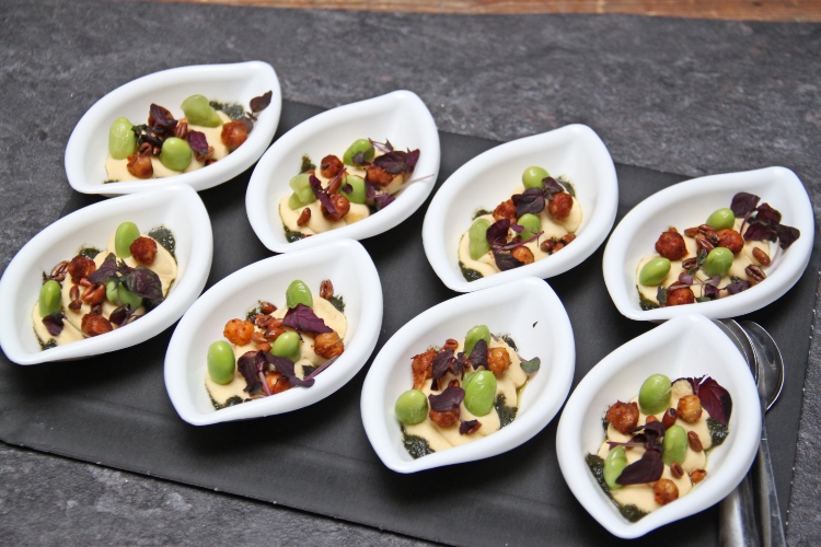 Ingrédients : Crémeux de pois chiche (pois chiche, bouillon de légumes, CREME, sel, poivre), fève, huile de menthe (huile de pépin de raisin, menthe, sel), pois chiche, EPEAUTRE frit, pousse pourpre, huile d'olive, paprika.