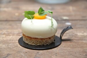Biscuit miel et épices, dôme de mousse légère chocolat blanc et insert agrumes