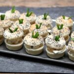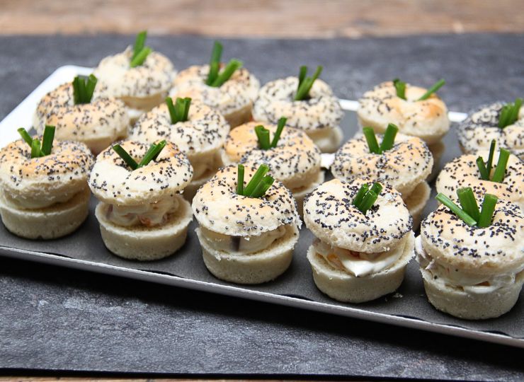 Ingrédients : Mini bagel (farine de BLE, eau, BEURRE, LAIT, sucre, graines de pavot, levure, sel, dextrose, jaune d'OEUF), appareil à bagel (crémeux de camembert (CREME, CAMEMBERT, beurre de cacao, gélatine), potimarron, pickles d'oignon (oignon, sucre, vinaigre de vin (SULFITES), sel, poivre), ciboulette.