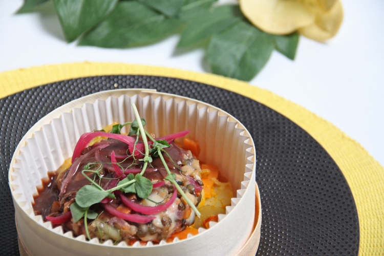 Ingrédients : Tagliatelles de légumes (potimarron, navet, patate douce, pomme de terre grenaille, courgette, huile d'olive, piment d'Espelette, sel, poivre), palet végétal (champignon de Paris, pois chiche, lentille, carotte, oignon, cantal (LAIT), fécule de pomme de terre, huile d'olive, estragon, sel, poivre), sauce brune (vin rouge (SULFITES), eau, parure de légumes, sauce soja (eau, graine de SOJA, blé (GLUTEN), sel, vinaigre d'alcool (SULFITES), sucre), chocolat noir, huile d'olive, fécule de pomme de terre), pickles d'oignons rouges (oignon rouge, eau, vinaigre de vin (SULFITES), sucre), pousse de petits pois.