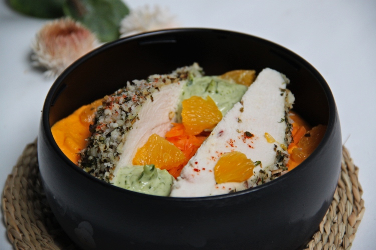 Plat de Viande : Suprême de poulet en croûte d’herbes, mousseline et julienne de carottes, sauce verte, suprême d’orange (gluten, lactose, oeuf, moutarde, sulfites, soja)