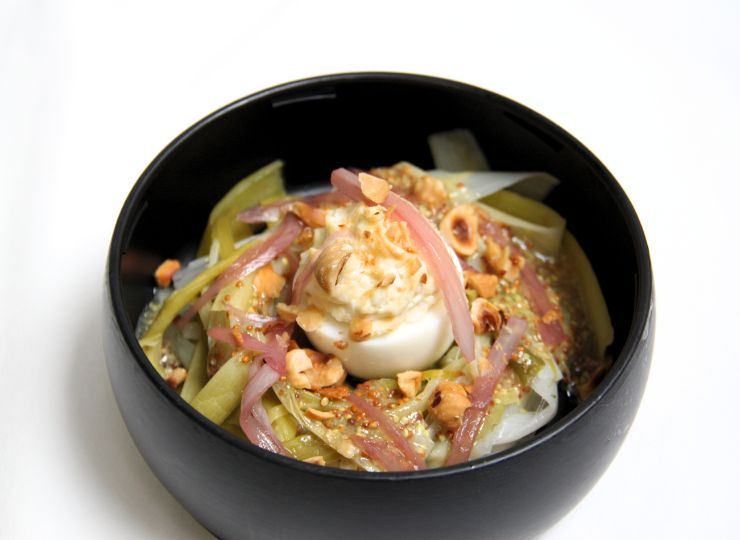 Tagliatelles de poireau, oeuf mimosa et vinaigrette à l’huile de noisette (oeuf, fruits à coque, moutarde, sulfites)