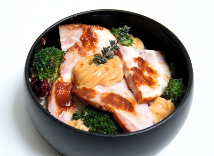 Rôti de porc miel-épices, riz madras et brocolis (oeuf, moutarde, sulfites)