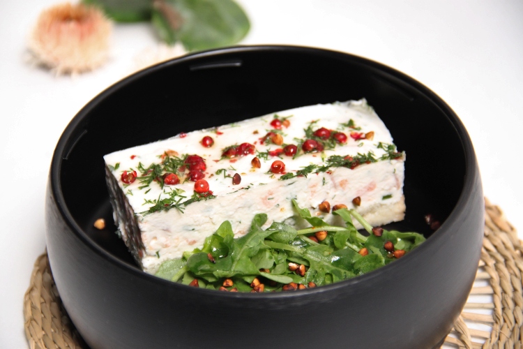 Entremet chèvre saumon, roquette et sarrasin torréfié (gluten, lactose, oeuf, poisson)