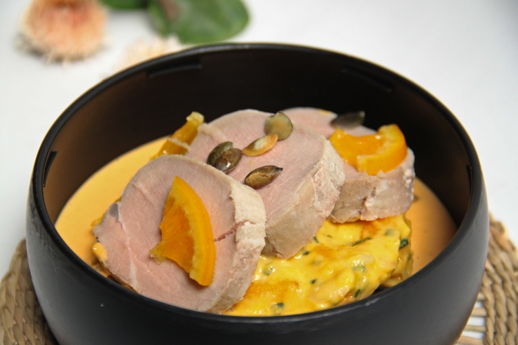 Mignon de porc, gratin de potimarrons, sauce carottes orange aux épices, pickles d’orange (oeufs, moutarde, sulfites)