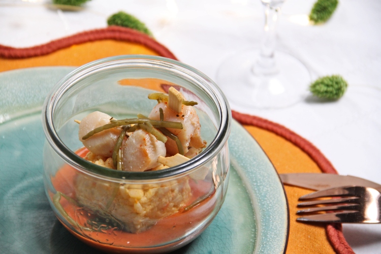 En bocal : risotto avec mini brunoise de petits légumes, St Jacques snackées, sauce armoricaine et salicorne