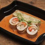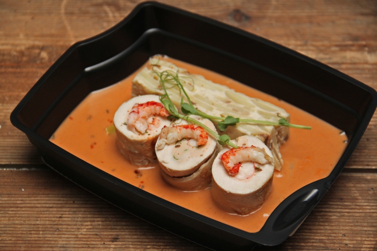 Filet de poulet, farce fine, écrevisse, sauce bisque, paprika, gratin dauphinois et poireaux