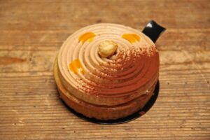 Pate sucrée, crème de noisette, brunoise de mangue, crémeux exotique, chantilly pralinée et gelée de passion, noisettes torréfiées.