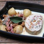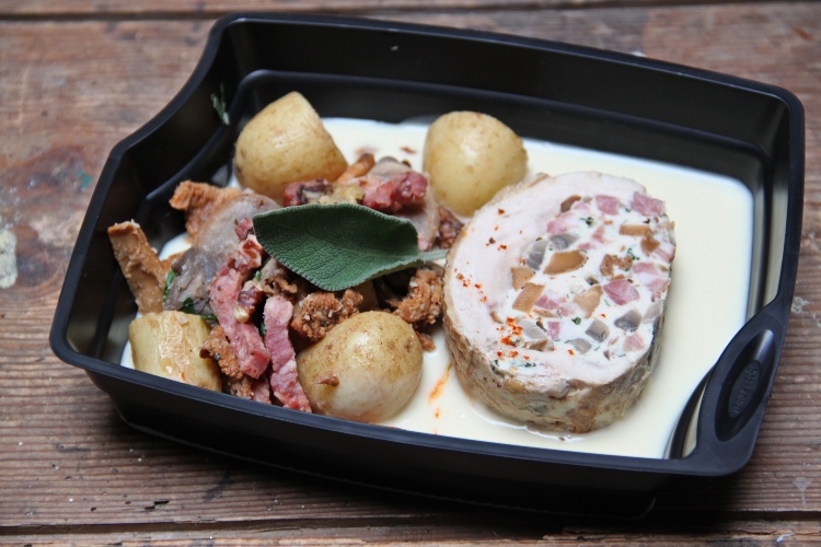 Ingrédients : Tournedos de pintade forestière (pintade*, farce (pintade*, champignon de Paris, lardon, girolles, CREME, OEUF, persil, sel, poivre), BEURRE 1/2 sel), pomme de terre grenaille, crème de vin jaune (fond de volaille (poulet*, garniture aromatique (CELERI)), vin du Jura (SULFITES), vin jaune (SULFITES), CREME, BEURRE 1/2 sel, échalote, roux (farine de BLE, BEURRE doux, graisse animale)), girolle, champignon de Paris, lardons, NOIX, BEURRE 1/2 sel, sauge. *Origine France