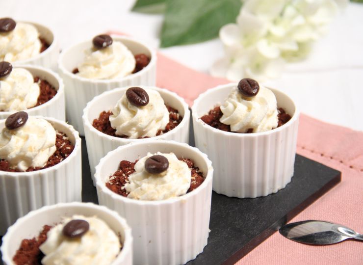 Ingrédients : Mousse café chocolat noir (CREME, crème anglaise (LAIT, jaune d'OEUF, sucre, gousse de vanille), chocolat noir, café), chantilly (CREME, sucre), crumble cacao (farine de BLE, poudre d'AMANDE, sucre, BEURRE, chocolat (graisse végétale (noix de coco, palmiste, palme, colza), poudre de cacao maigre, poudre de LAIT entier, sucre, émulsifiant, lécithine de SOJA)), grain de café, fève tonka.